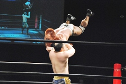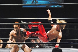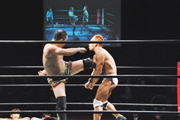 バックフリップ狙うが佐藤ブロック。マイケルロープに飛ぶ、佐藤カウンターのミドルキック(右写真)。