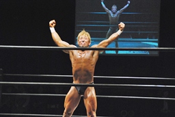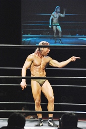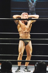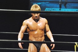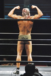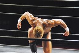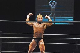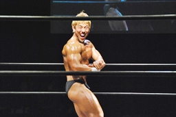 今回の三本勝負、一本目はボディビルマッチ。まずは挑戦者の諸橋晴也が入場(右写真)