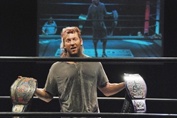 王者のケニーは2本のベルトを手にシャツ着て入場(左写真)。