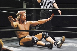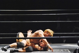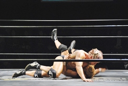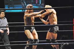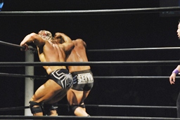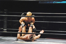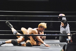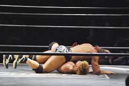 ケニー足をすくってカバー(右写真)、カウント入る前に諸橋キックアウト。諸橋も足をすくってカバー、ケニーカウント入る前に返す。