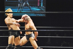 ケニー諸橋をオーバーザトップロープ(右写真)、諸橋はエプロンに着地。