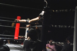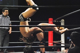 トップロープ越しにパンチとチョップの打ち合い。ケニー諸橋を飛び越えて回転エビ固め(右写真)、