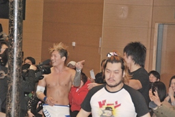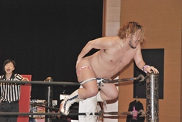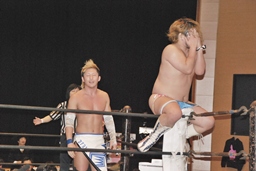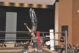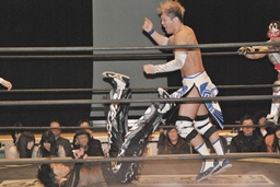 MIKAMIはディーノの尻にドロップキック(左写真)、場外に落とす。
