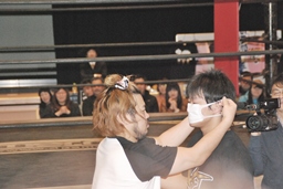 大石凛音をコーナーに振る、凛音ブロックするが大石は張り手(右写真)、ディーノの尻に。