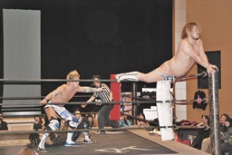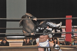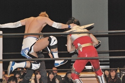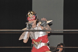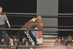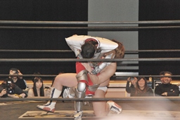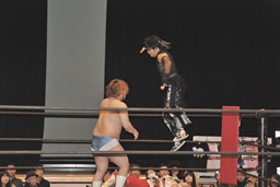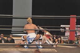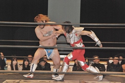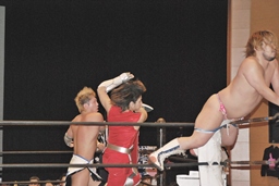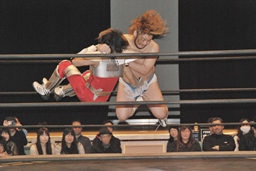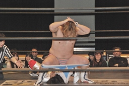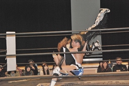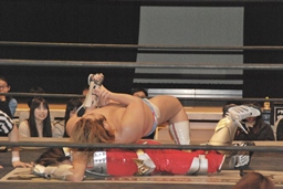 ディーノをコーナーに振ってジャンピングハイキック、腕取ってオルフェーヴル(左写真)、ディーノロープ。MIKAMIは凛音にタッチ。5分経過。