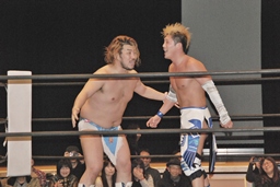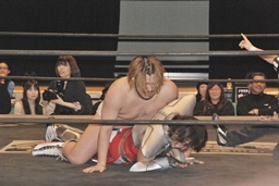 先発はMIKAMIと大石。大石足をすくう(左写真)、