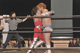 キス(左写真)。凛音ブレークしてペガサス流星拳、MIKAMIにタッチ。ディーノも大石にタッチ。