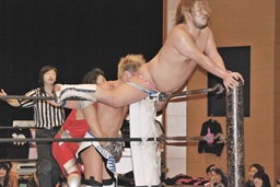 ロープワークからアームドラッグの打ち合い(右写真)。両軍タッチ。