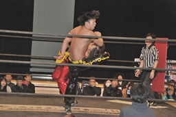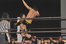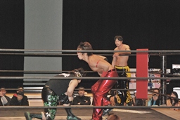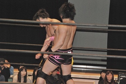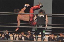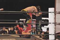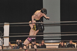 コーナーに上ってダイビングダブルニーアタック(左写真)、カウント2。KUDOハイキック、ミドルキック、石井かわしてドロップキック、高尾にタッチ。