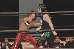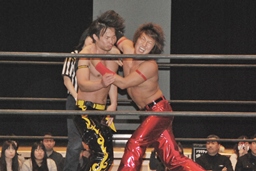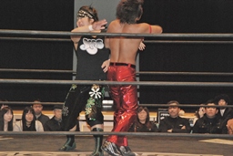 KUDOミドルキック、石井張り手(左写真)。エルボーの打ち合い、石井ロープに飛ぶ、KUDOミドルキック、ウラノにタッチ。石井も高尾にタッチ。