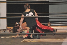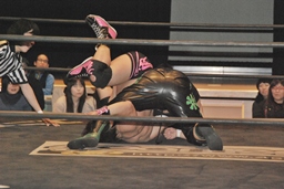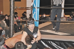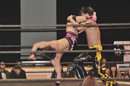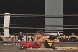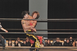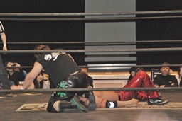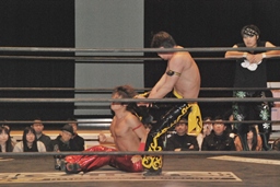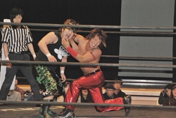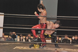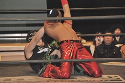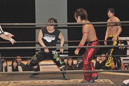 ウラノ十字架固め(右写真)、カウント2。立ち上がったところに延髄蹴り、KUDOにタッチ。