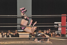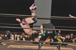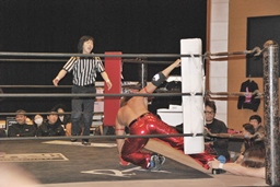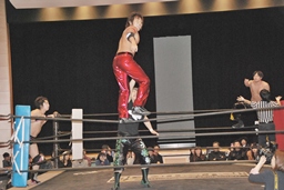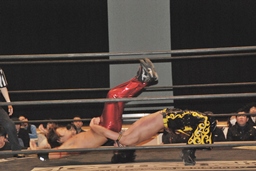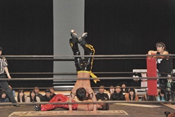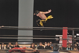 ダイビングマッスルストンプ(右写真)。ウラノと高尾はボディへのパンチの打ち合い、ウラノ足を踏んでロープに飛ぶ、高尾カウンターのドロップキック。両軍タッチ。