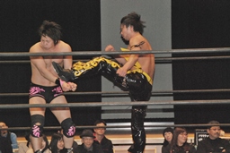 先発はKUDOと石井(右写真)。KUDOが腕を骨折した去年の札幌大会以来の対戦。
