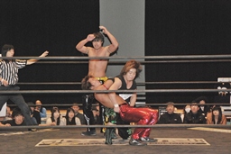 KUDOボディスラムから倒立式ダブルニードロップ(左写真)、カウント2。ウラノにタッチ。