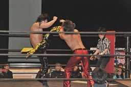 高尾ヘッドロック、ウラノロープに振ってショルダーブロックの打ち合い(左写真)、