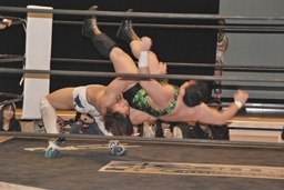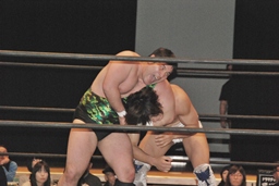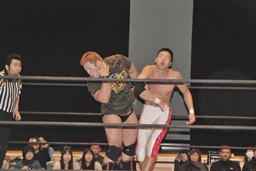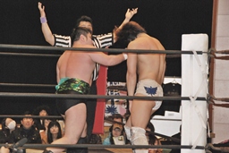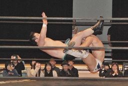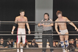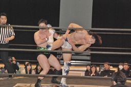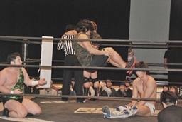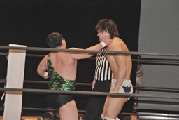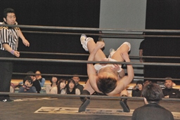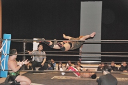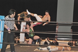 火野が松井レフェリーの気を逸らす。その間に佐々木が入って竹下にダブルのフラップジャック(右写真)。