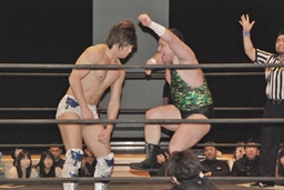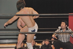 その場跳びシューティングスタープレス(左写真)、カウント2。