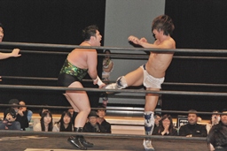 火野が入って竹下にラリアット(左写真)。