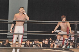 竹下「福岡の皆さん初めまして。今日福岡で初めて試合できて、勝ててチョー嬉しいです。でも、今日勝てたのは飯伏さんの力が大きいので、飯伏さんに締めてもらいます。」(右写真)