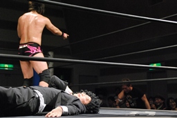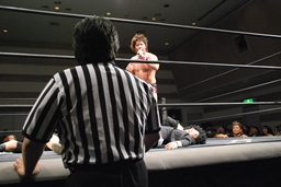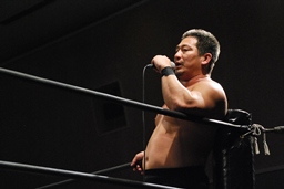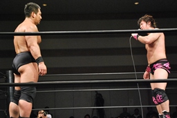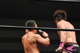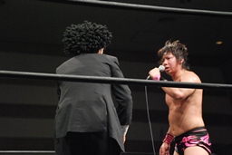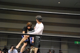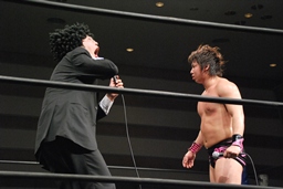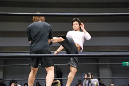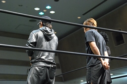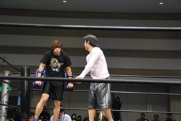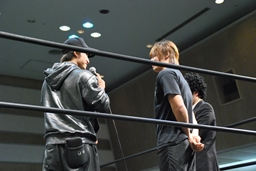3/20にプロレスデビューする才賀紀左衛門が友人で3/20のパートナーの飯伏とともにリングに(右写真)