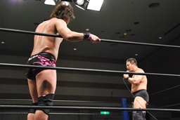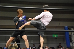 紀左衛門は飯伏のスキを突いてハイキック、飯伏かわす(右写真)。