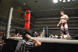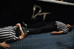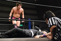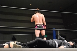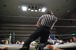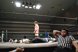 GMも倒れる。松井レフェリーが駆け寄る(左写真)。