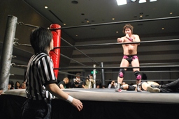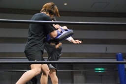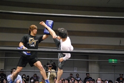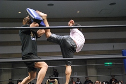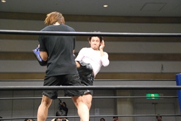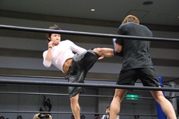 GMの要請により飯伏をパートナーにキックのデモンストレーションをやることに(右写真)。