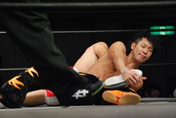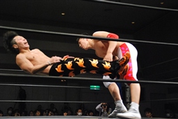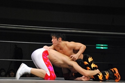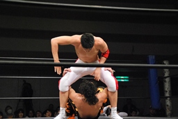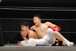 高梨低空ドロップキック(左写真)。ロープに足をひっかけてヒップドロップ。5分経過。
