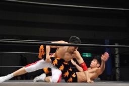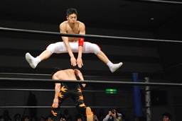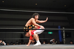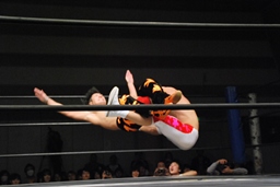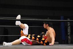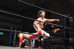 低空ドロップキック(右写真)。高梨足にストンピング、張り手、ロープに飛ぶ、竹下カウンターのドロップキック狙うが高梨読んでスカす。足にストンピング、レッグブリーカー。