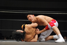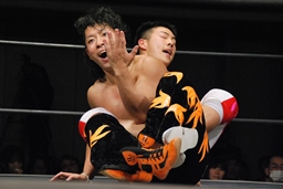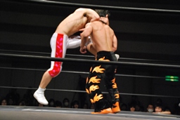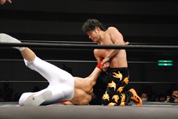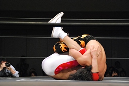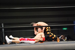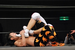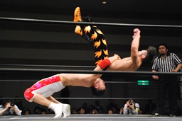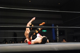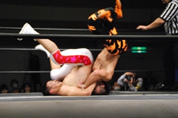腕を首に回してコブラクラッチ(左写真)。首投げからカバー、カウント1。