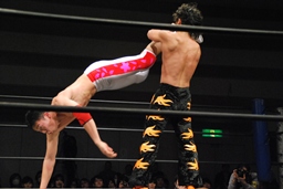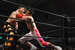 竹下エルボー、タッチダウン狙う、高梨ブロックして延髄蹴り(左写真)。