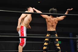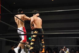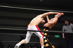 竹下エルボー、逆水平(右写真)、高梨はローキック。