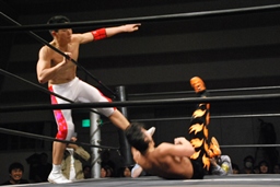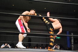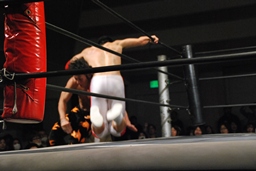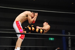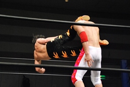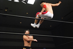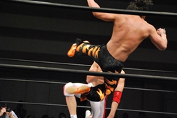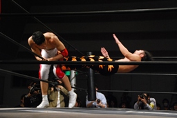 コーナーに上ってジャベリンキック(右写真)、カウント2。10分経過。