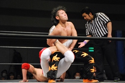竹下コーナーに振る、高梨切り返して低空ドロップキックから足にキック、レッグロックに(右写真)。