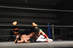 竹下突っ込む、高梨はロープを引き下げて竹下をエプロンに出す。高梨ぐるぐるパンチ、竹下ブロックしてエプロンからパンチ(左写真)、