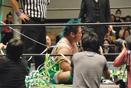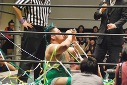 ようやく立ち上がった入江「僕が勝ちましたよ。ケニー・オメガなんて、ケニー・オメガなんて絶対に倒せないと思ってたし、試合しててもあきらめそうになったけど、僕の名前を応援してくれた皆さん、セコンドの皆、ドリフの皆、全てが僕の力になりました。ありがとう。」(左写真)