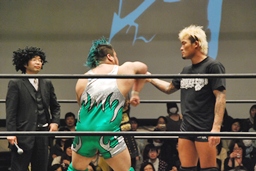 次期挑戦者・坂口がリングに上がり拳を突き出す(右写真)。