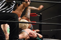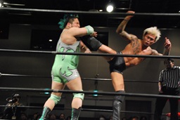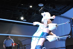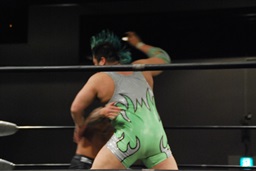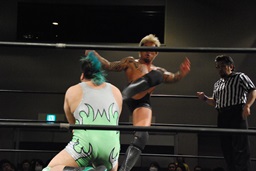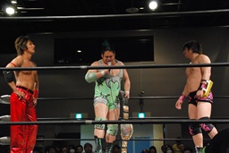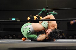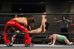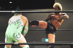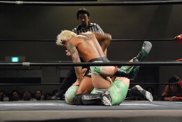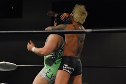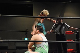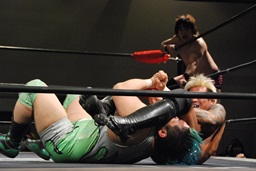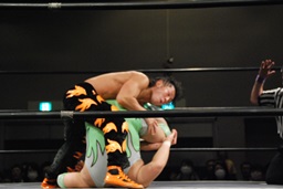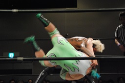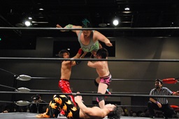 入江がロープに飛んでフラップジャック式ボディプレス(右写真)、坂口と彰人がカット。高尾が坂口に延髄蹴り、石井は彰人にフィッシャーマンバスター。