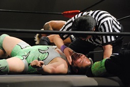 入江ボディスラム、コーナーに上ってフライングソーセージ(左写真)、カウント3。