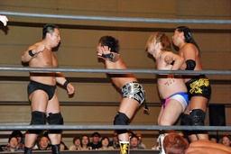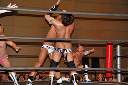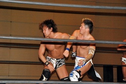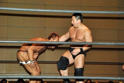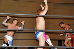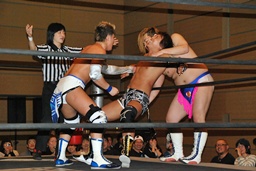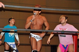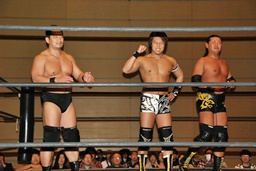 昨日FACEで新メンバーとなった平田を加えた高木&大鷲新ユニット(右写真)。役割分担は高木が全力で入場、大鷲が頑張ってしゃべり、平田が試合頑張る、だそうである。