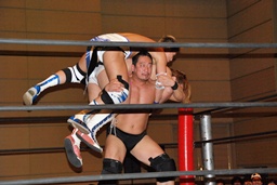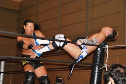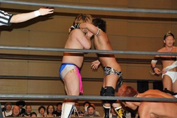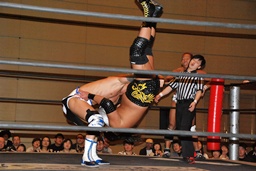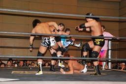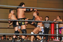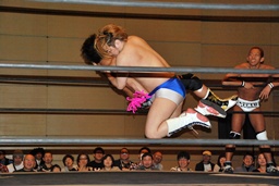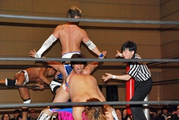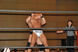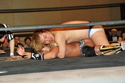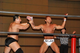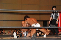 しかし高木は腕を取って自爆させる(右写真)。カバー、ディーノがカット。高木は平田にタッチ。
