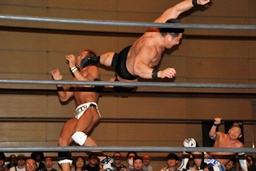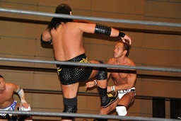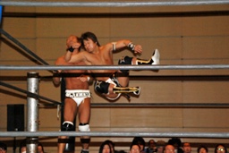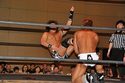 大鷲は大石をコーナーに振って突っ込む、大石カウンターのキック(右写真)。大石ロープに飛ぶ、大鷲カウンターのビッグブーツ、大石かわす。