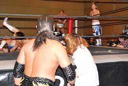高木ドラゴンリングイン、マイケルガットショットで迎撃。マイケルロープに振る、高木切り返してドロップキック(右写真)。