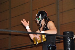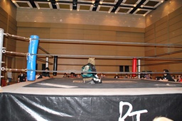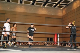 休憩時間中からリングに正座してサムライを待つニラ(右写真)。