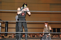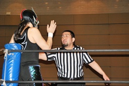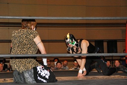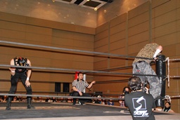 サムライがリングイン、ニラを見て松井レフェリーに何か尋ねる(左写真)。松井レフェリーの返答「この人です。いつものことです。」