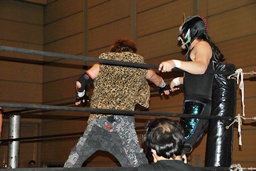 2人コーナーに上る(左写真)、サムライ首絞める、ニラはくしゃみで落とす。