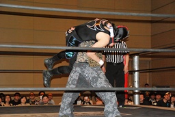 ニラスモールパッケージホールド狙うがサムライ切り返して(右写真)リバースDDT。