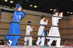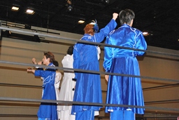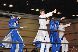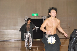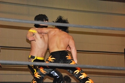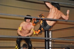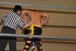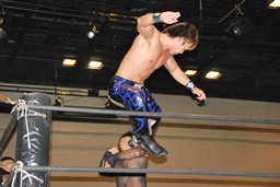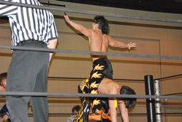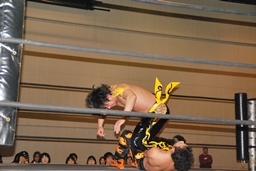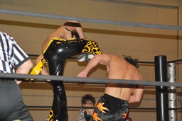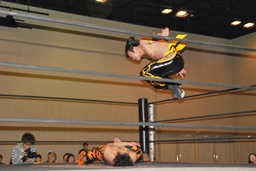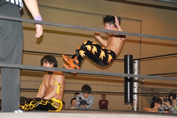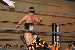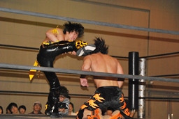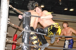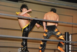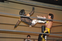 MIKAMIダイビングチョップ、ロープに振る、KUDO切り返す、MIKAMIフライングラリアット(右写真)。KUDOスピンキック、HARASHIMAにタッチ。