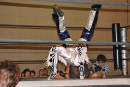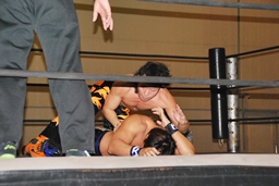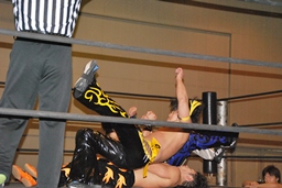 KUDOボディスラムから倒立式ダブルニードロップ(右写真)、カウント2。5分経過。