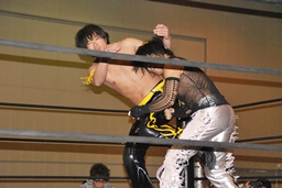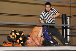 HARASHIMA山折り狙って肩に担ぐ、MIKAMI着地、HARASHIMAハイキック、MIKAMIかわしてドラゴンスープレックスホールド(左写真)、カウント2。
